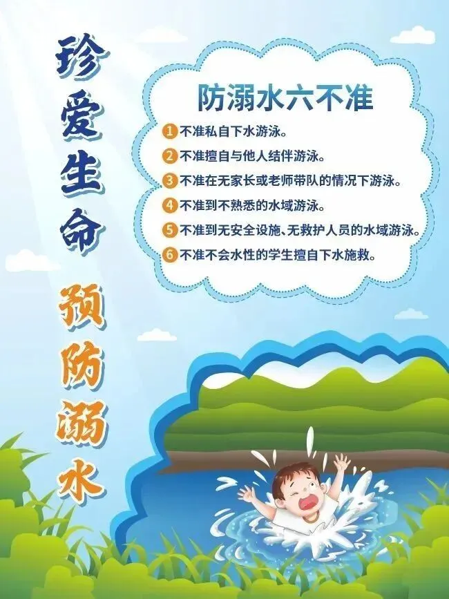 天气逐渐炎热,假期里加强对孩子预防溺水的安全教育和监护工作,教育孩子做到以下六不准,遇到有落水者要呼叫大人救助,不要盲目施救,同时要及时报警(拨打110)。