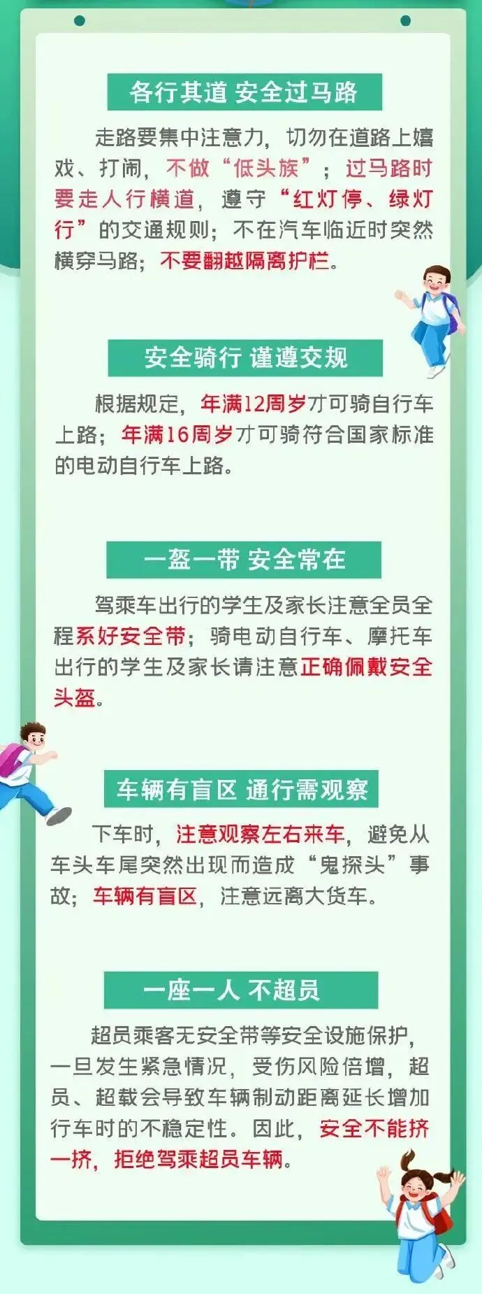 家长要以身作则,严格遵守交通规则。教育孩子遵守交通规则,不在马路上玩耍,防止意外事故的发生;注意人身及财产安全,不乘坐拼装车、报废车、拖拉机和非法营运客车等存在安全隐患的交通工具,不乘坐存在超员、超载的客车;未满16周岁的学生不能骑电动车上路,不能骑改装电车上路,骑乘电动自行车按规定佩戴安全头盔。严禁无证驾驶机动车、酒驾、超载、飙车、围观飙车、逆行等行为。