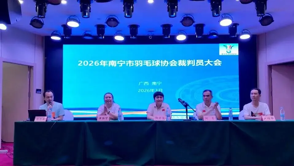 3月28日,2026年南宁市羽毛球协会(以下简称“南宁羽协”)裁判员大会在艾斯曼国际酒店五楼会议室圆满召开,全市百余名注册裁判员齐聚一堂。南宁市社会体育发展服务中心相关负责同志,南宁羽协会长何志、秘书长黄振宇、竞赛部部长(国家级裁判员)卢绍华出席了此次会议。会议由南宁羽协裁委会主任(国家级裁判员)吕忠其主持,多名国家级裁判员代表列席。