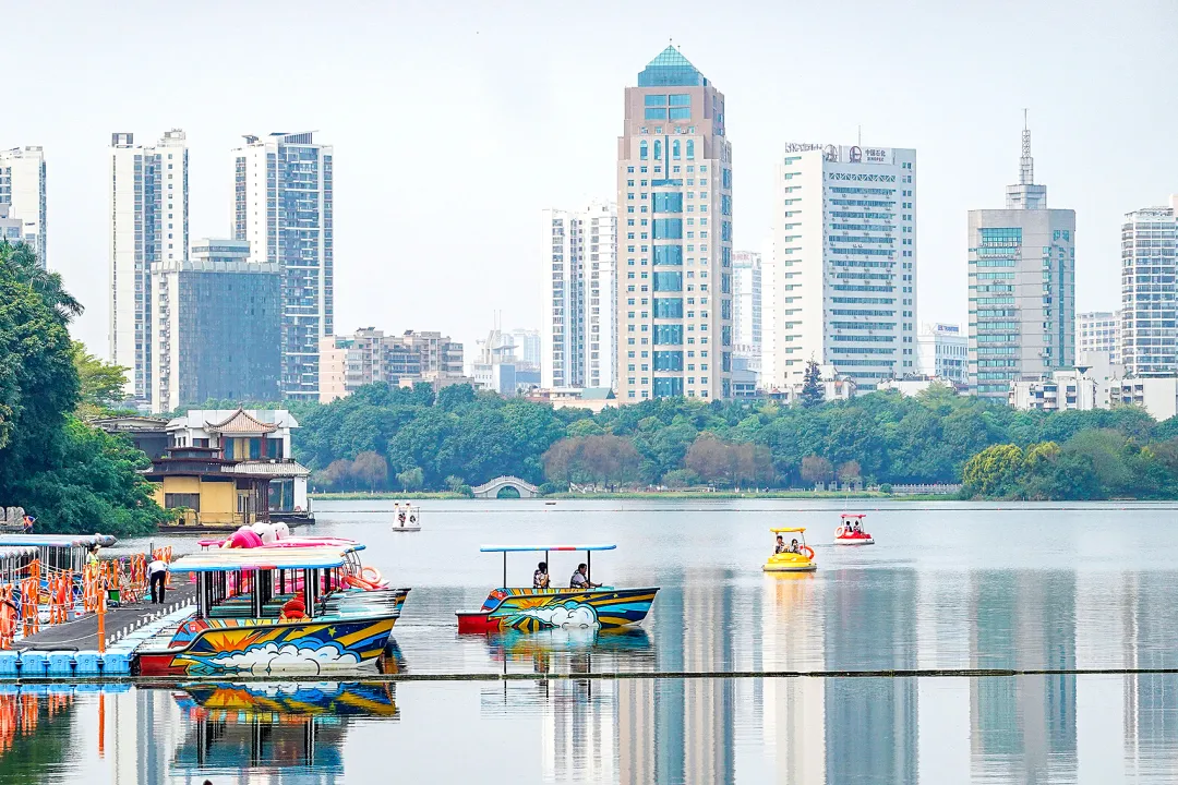 湖面,造型别致、色彩缤纷的游船悠然穿梭;岸边,林木葱郁,与错落有致的城市高楼相映成趣,勾勒出一幅人与自然和谐共生的春日画卷。
