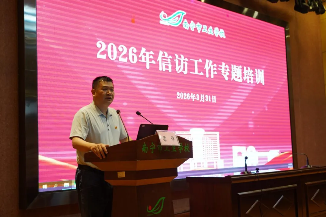 为深入贯彻落实自治区2026年新春第一会精神及市卫健委有关工作要求,着力构建信访工作长效机制,3月31日下午,南宁市卫生学校召开2026年信访工作专题培训会,培训会由学校副校长梁恒主讲,对学校新出台的《南宁市卫生学校信访工作制度》、《南宁市卫生学校信访工作主动治理实施方案》进行系统解读,全体教职工参加会议。