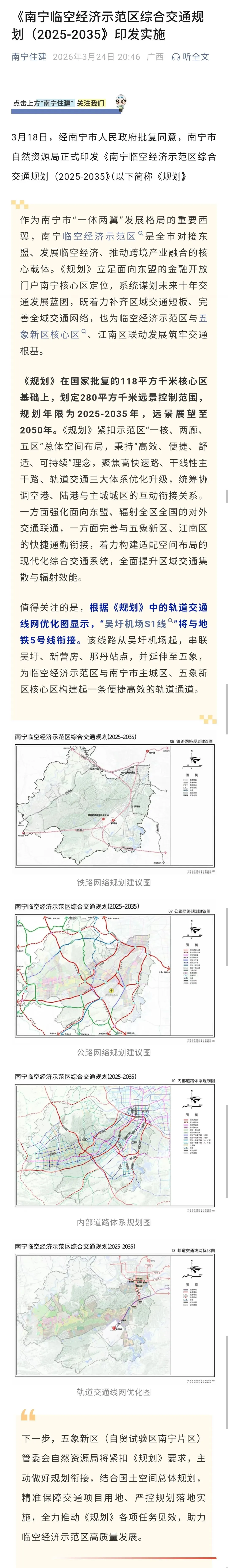 路通百通,路网织密则发展提速。未来10年,随着这些交通项目逐一落地,吴圩与扶绥的融合发展将迈入新阶段,南宁临空经济示范区的枢纽优势、区位优势将彻底释放。