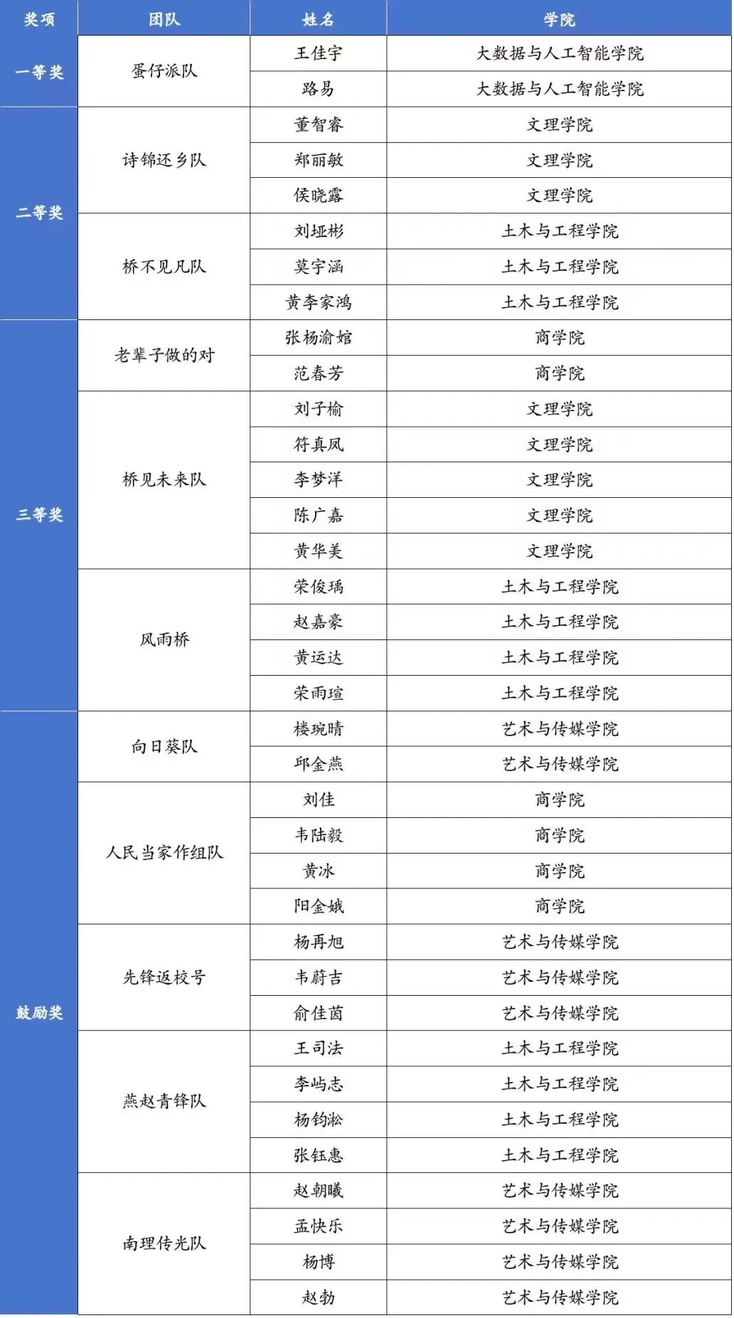 本次“桥梁计划”汇报总结暨颁奖典礼邀请了土木与工程学院分团委书记徐远菁老师、信息工程学院分团委书记马宇老师、商学院分团委书记申钰汉老师、文理学院分团委书记仝广凯老师、大数据与人工智能学院分团委书记周健老师、艺术与传媒学院辅导员黄江信老师及招生处伍劲宇老师、朱浩老师、张奥男老师、马嘉嘉老师、覃明丽老师担任评委。