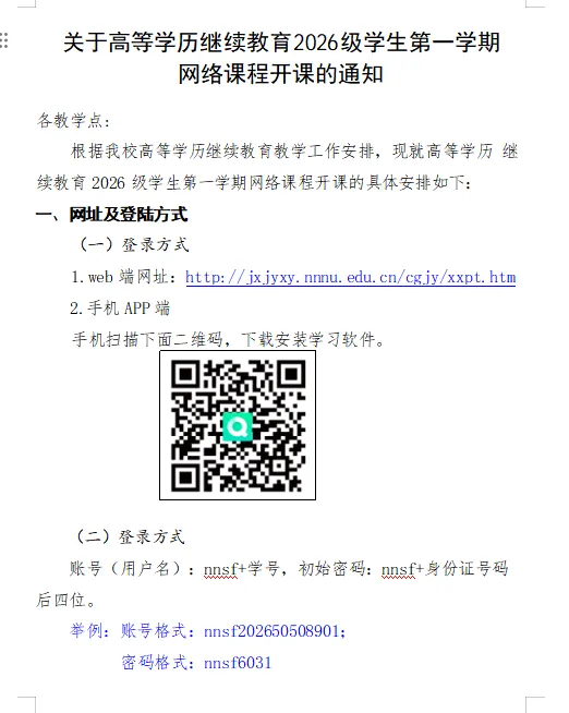 南宁师范大学高等学历继续教育学院,2026级学生开课学习通知