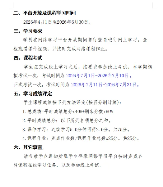 1.学生在完成线上学习之后,按要求参加线上考试,本学期模拟考试一次,考试时间为 2026年7月1日-2026年7月10日。