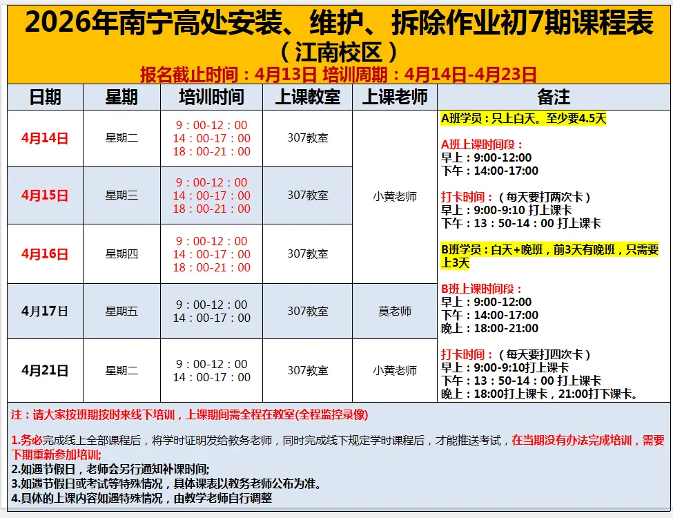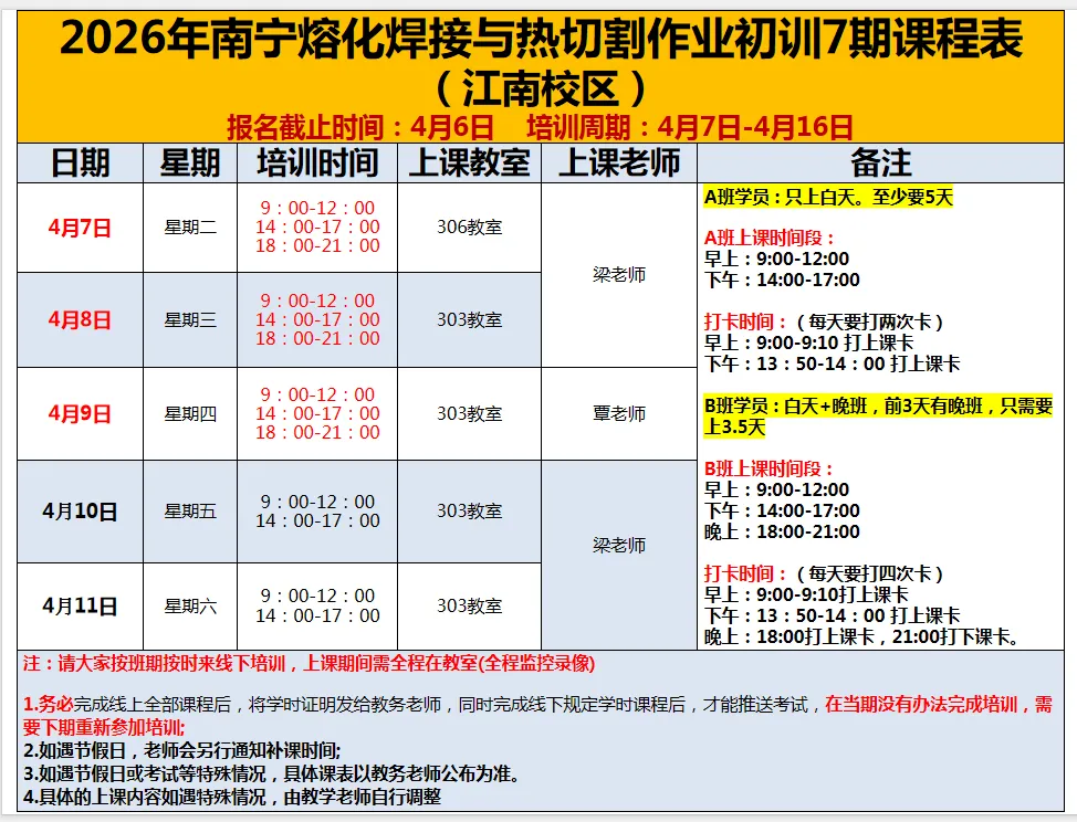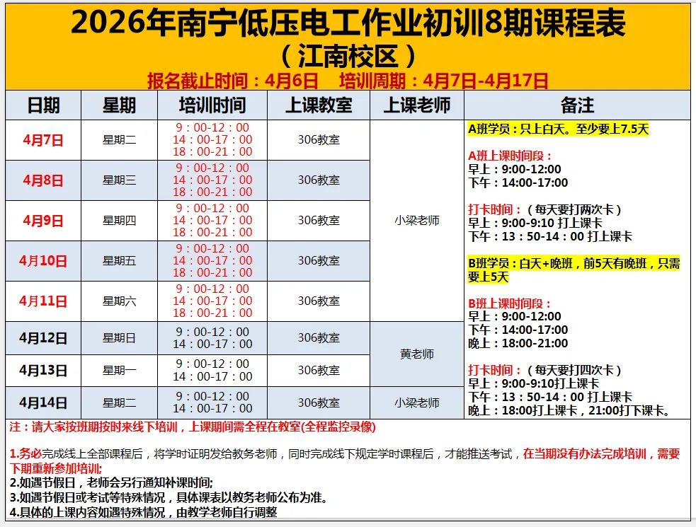 为了全面贯彻落实《中华人民共和国安全生产法》《特种作业人员安全技术培训考核办法》等文件规定,“特种作业人员当按照国家有关规定取得相应资格证书,方可从事相关工作”。为满足企业及社会作业人员的需要,南宁市江南区于2026年4月举办《低压电工作业》《高压电工作业》《高处安装、维护、拆除作业》《熔化焊接与热切割作业》等特种作业人员培训班,现将有关事项通知如下:考试科目:考试分为理论+实操考试,理论(线上)+技能(线下)(复审学员只需参加理论考试)