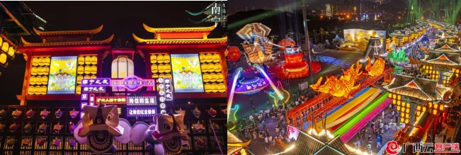 集文化、美食、旅游为一体传统与现代结合的模式,街区整体建筑雕梁画栋妙融入广西特色的壮乡文化不仅有盛唐复古风更有壮乡民族风。16个行为艺术舞台17处美陈装置、10组大型娱乐设施100多处各种网红打卡点