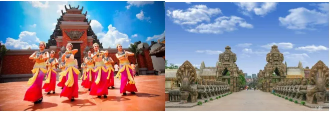 离开亲子游玩区,我们来到了柬埔寨主题区,迎面的宏伟建筑是东方四大奇迹之一的吴哥窟,快拿起你的手机来一张合照吧!【走进吴哥】是目前世界上最大的弧形巨幕影院,神奇美妙的观影效果,震撼再现柬埔寨悠久灿烂的历史文化和吴哥建筑的奇迹。走进吴哥的左边是魔方幻影剧场【万塔之城】,通过虚景和真人舞台表演完美的演绎,让您置身在唯美梦幻的蒲甘,追忆缅甸千年古老王朝的繁华盛景
