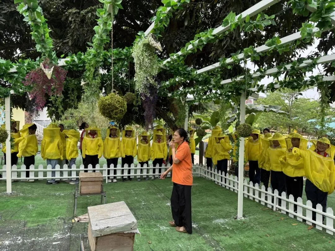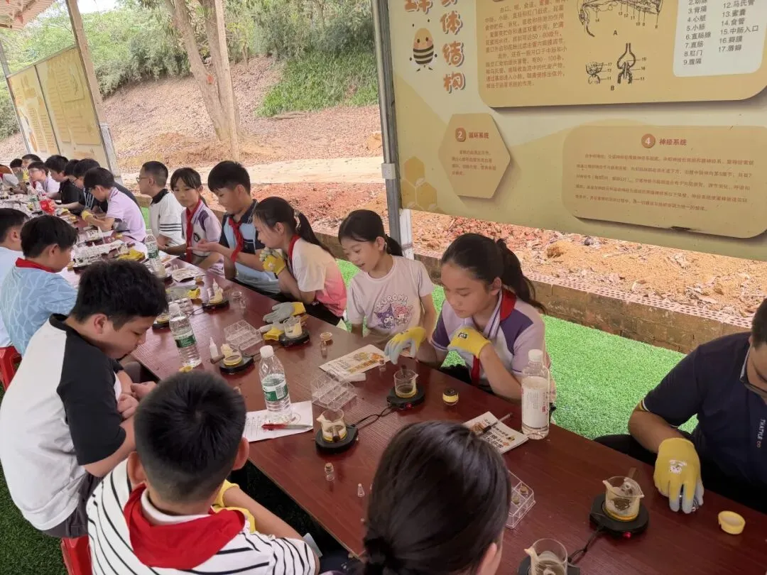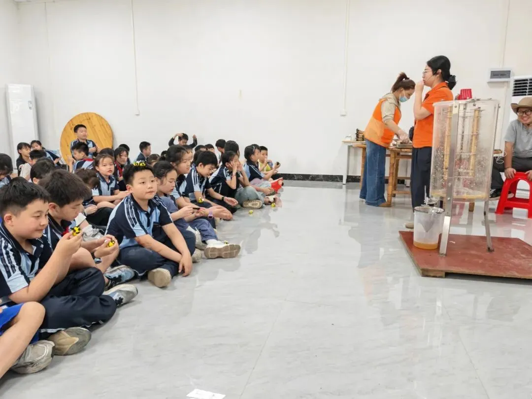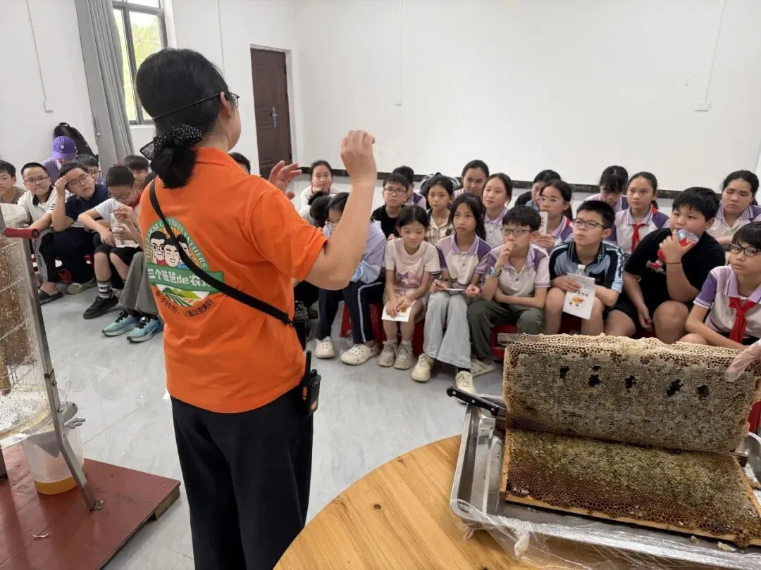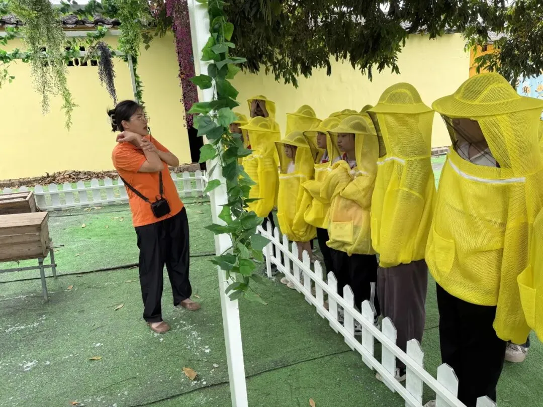 抵达基地后,“蜜蜂科普”环节正式启幕,点燃了同学们的探索热情。在导师带领下,同学们身着专业防蜂服,化身“小小养蜂人”,近距离观察蜜蜂筑巢、采蜜,导师结合实物与案例,讲解蜜蜂的社会结构、酿蜜流程及生态作用。随后,同学们亲手体验摇蜜、品尝鲜蜜,还制作了蜂蜜润唇膏和蜜蜂黏土作品。这一环节消除了大家对昆虫的畏惧,让同学们感受自然馈赠,读懂劳动价值。