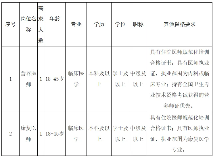 1.具有良好的政治素质和道德品行。2.医德医风高尚,责任心强,能吃苦耐劳,具有奉献精神。3.具有正常履行职责的身体条件和符合岗位要求的文化程度。4.具备岗位要求的其他条件。5.优秀人才适当放宽年龄限制。