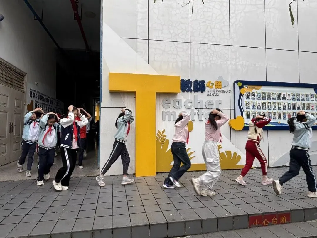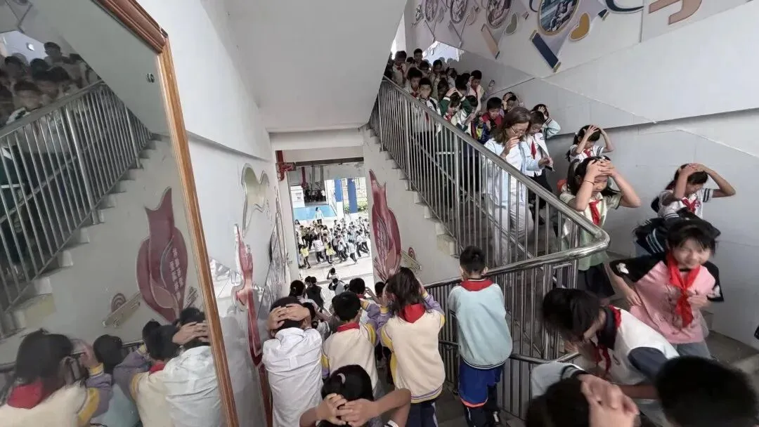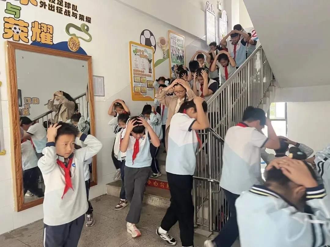 行进过程中,师生们保持规范动作,以略快于日常出操的步伐稳健前行,全程不推搡、不喧哗、不奔跑,高效且有序地抵达班级升旗列队指定区域,迅速完成抱头蹲防等应急动作。