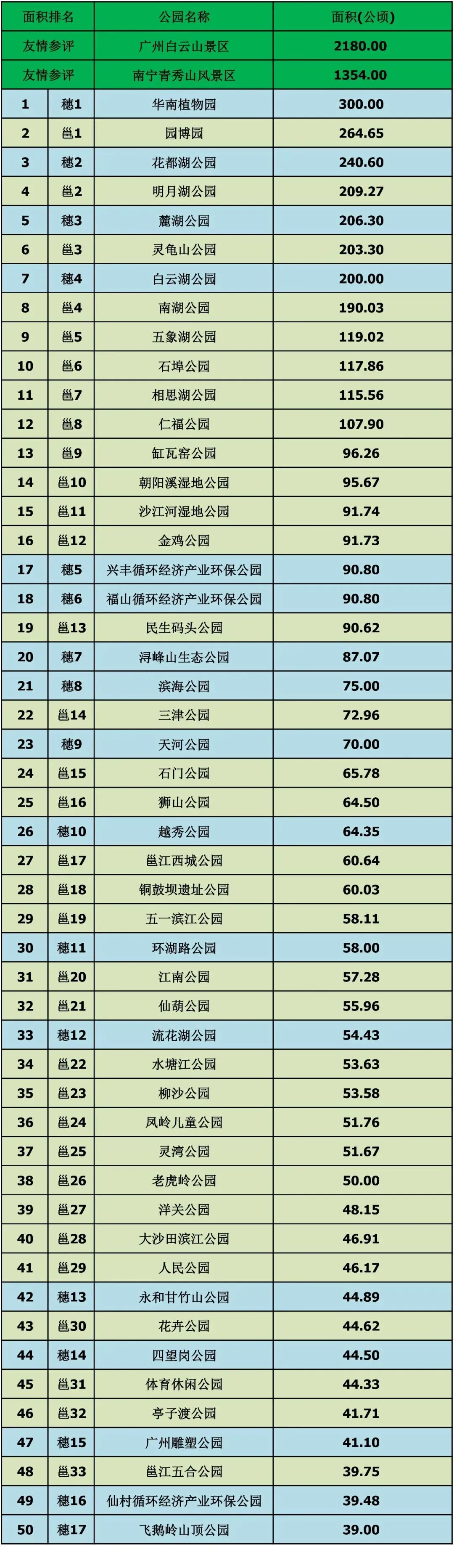 数据来源:广州公园TOP50选自2020年《广州市公园名录》,南宁公园TOP50选自《南宁市公园名录》(2023年版)。了解更多南宁公园的完整信息,欢迎点击以下链接。