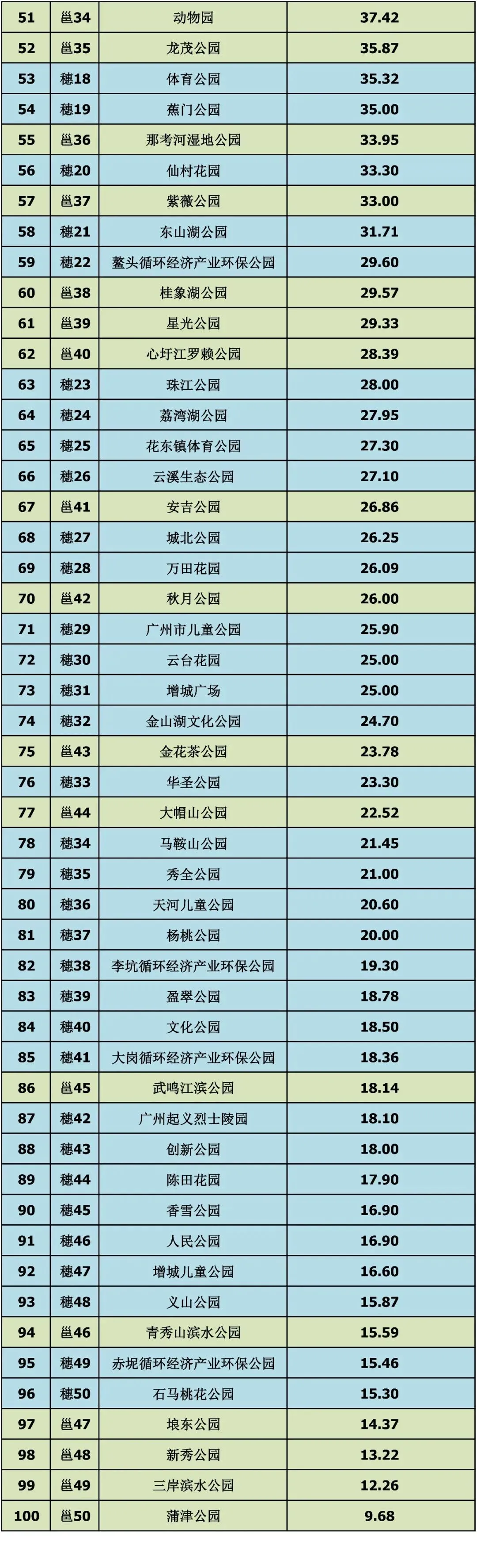 小微众多:广州有38个上榜公园面积不足50公顷,说明其土地利用率更精细,但也稀释了前50名的总面积均值。