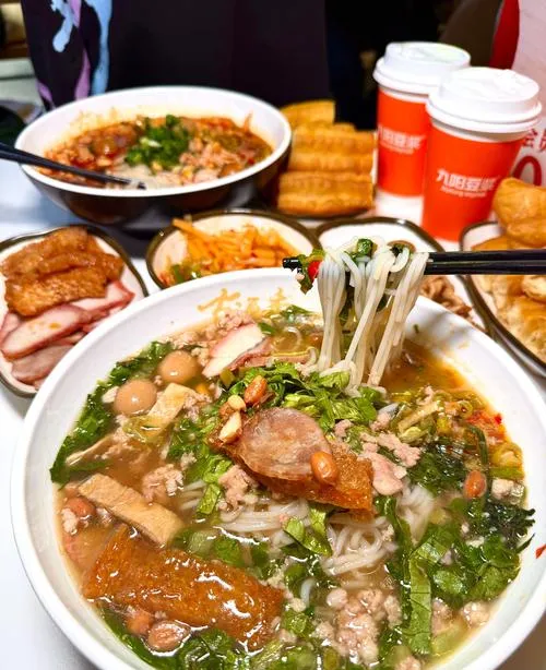 老友粉是南宁的招牌美食,但它不是那种精致的美食,是一种接地气的美食。这种粉汤底是用猪骨、酸笋、豆豉、辣椒熬出来的,闻起来有点酸臭,但喝起来特别鲜,那种鲜不是味精调出来的,是食材本身的味道。粉条很滑,配菜有酸笋、木耳、猪肉,每一样都不多,但搭配在一起刚刚好,你吃完一碗会觉得很满足,不是那种撑的满足,是一种刚好吃饱的满足。