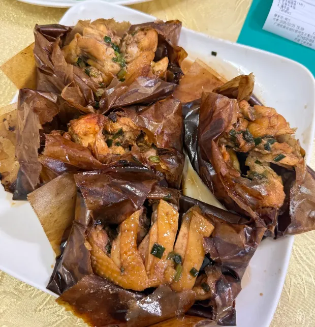 纸包鸡做法不复杂。鸡块先用酱油、蒜蓉、糖和一点酒腌透,再用油纸一层层包好下锅炸。纸锁住汁水,外头不焦,里头却熟得透,拆开的那一下,香气最要命。