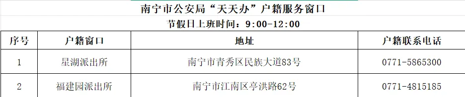 一、2026年4月4日(星期六)至2026年4月6日(星期一)清明节放假期间,青秀分局星湖派出所、江南分局福建园派出所户籍窗口对外办公,提供“天天办”户籍服务,上班时间为上午9:00-12:00。
