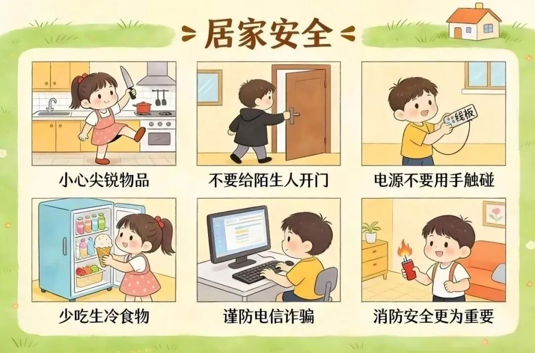 1.假期居家时,收好家里的尖锐物品、药品、打火机、电源插座等危险物品;