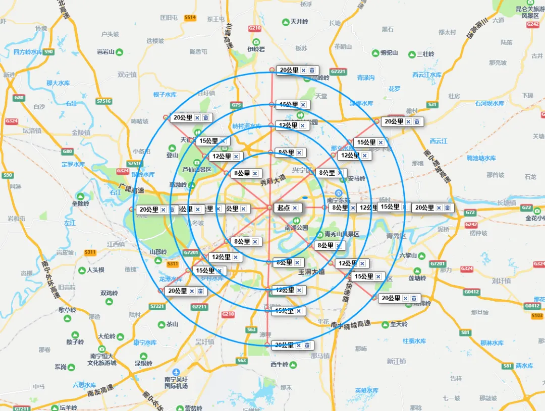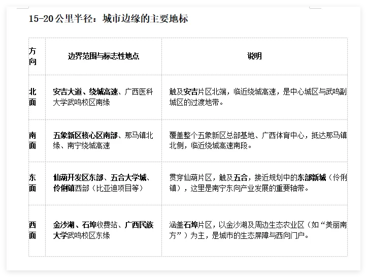 以朝阳商圈为中心,15-20公里这个半径范围,已经明显超出了快速环路(快环) 所围合的传统主城区,开始触及到南宁市规划的 “一主三副”多中心结构中的外围组团和生态屏障。