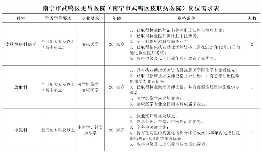 4.报名地址:南宁市武鸣区城厢镇宁武路9号更昌医院业务综合楼六楼人事科办公室。