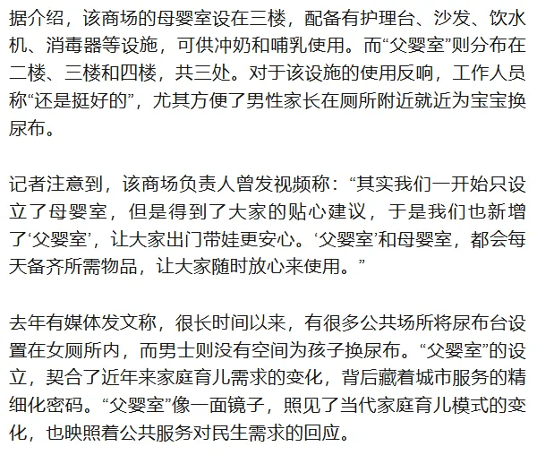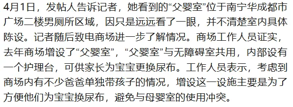 近日,广西南宁一商场内设置的“父婴室”引发广泛关注。3月31日,有市民发帖称,在南宁华成都市广场首次见到“父婴室”,引发网友热议。不少网友对这一设施表示认可,认为“有的母亲要喂奶,男女分开更好”。记者注意到,近年来,全国多地商场陆续增设“父婴室”,此前胖东来也因类似设施登上热搜,收获大量好评。
