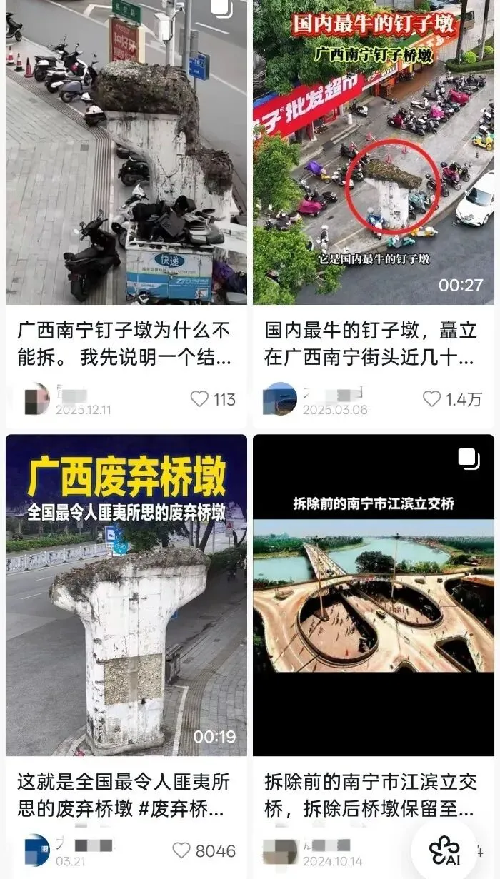 大皖新闻记者注意到,近年来,在多个社交平台,均有视频或帖文提及,南宁江滨立交桥拆除后,遗留了两个桥墩一直未拆,此地已成闹市区,该桥墩也成了别样的“城市地标”。