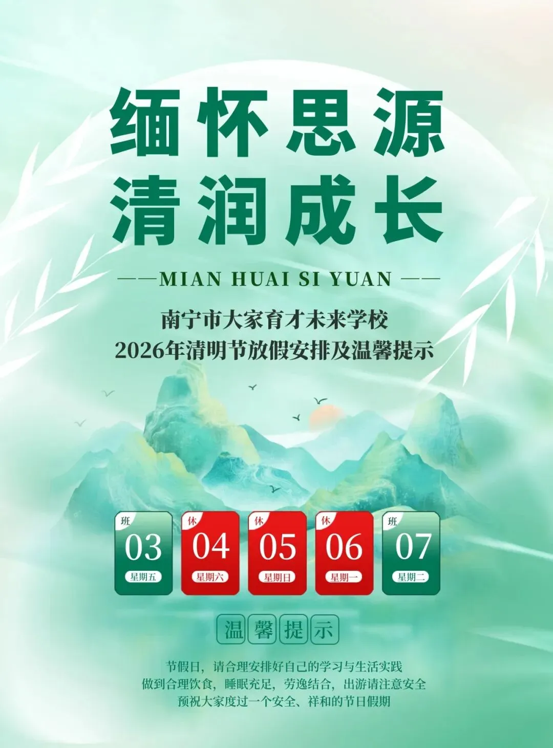 缅怀思源 清润成长——南宁市大家育才未来学校2026年清明节放假安排及温馨提示