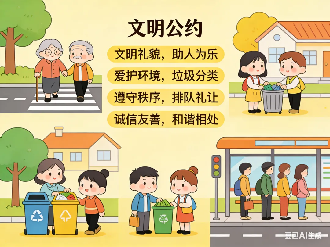 4.严于律己,践行文明公约:自觉遵守社会公德,爱护公共设施,讲文明、懂礼貌,展现我校学生的良好精神风貌。