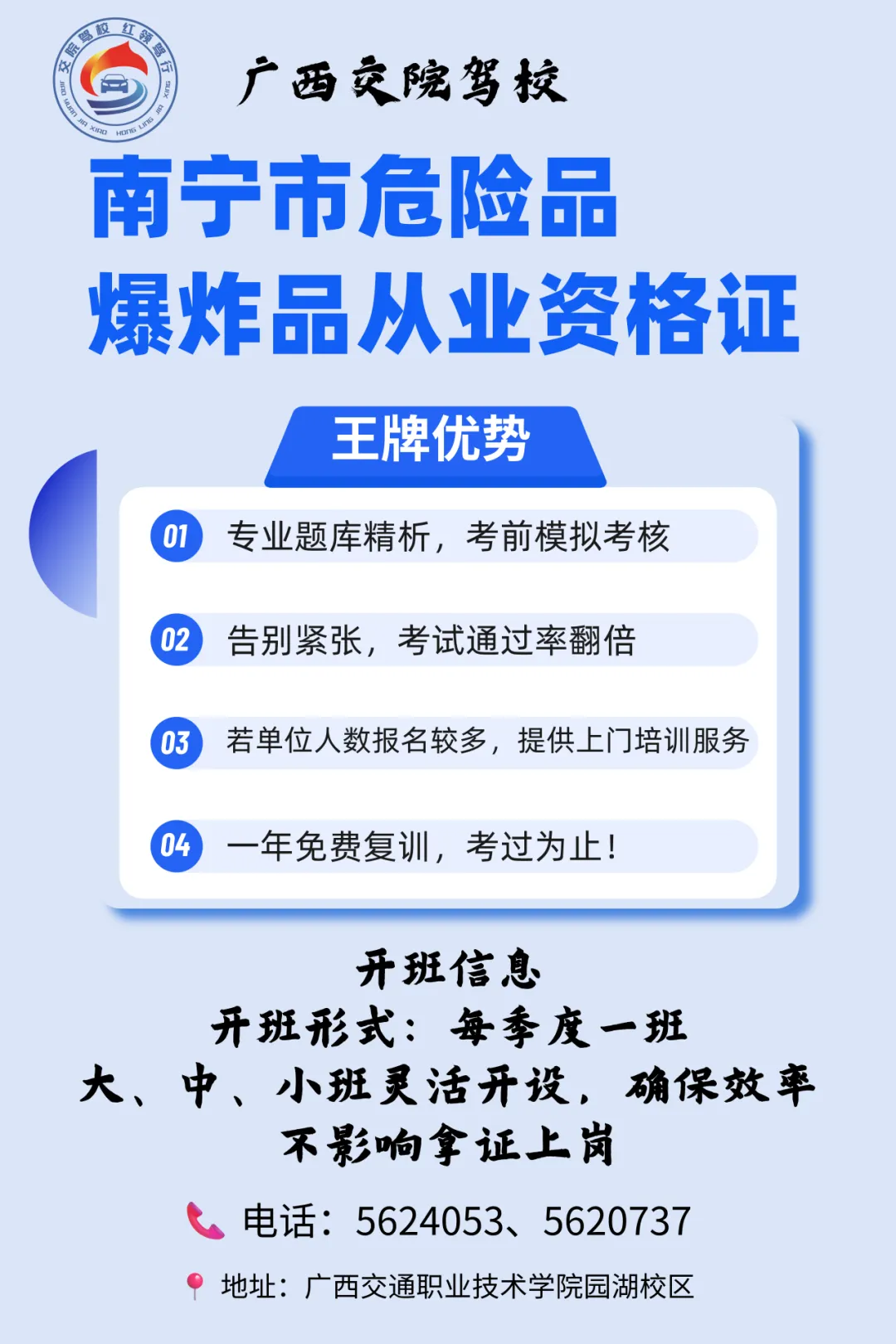在危险品运输行业,从业资格证是合法从业的“敲门砖”,更是安全运营的“通行证”!针对危险品经营企业对运输及押运人员的缺口需求,广西交院驾校作为具备相关培训资质的国企驾校,长期开展危险品、爆炸品道路运输从业人员资格培训服务。从协作报名到精心教学,再到组织考核,一站式搞定,让你轻松获证上岗,提升就业含金量。