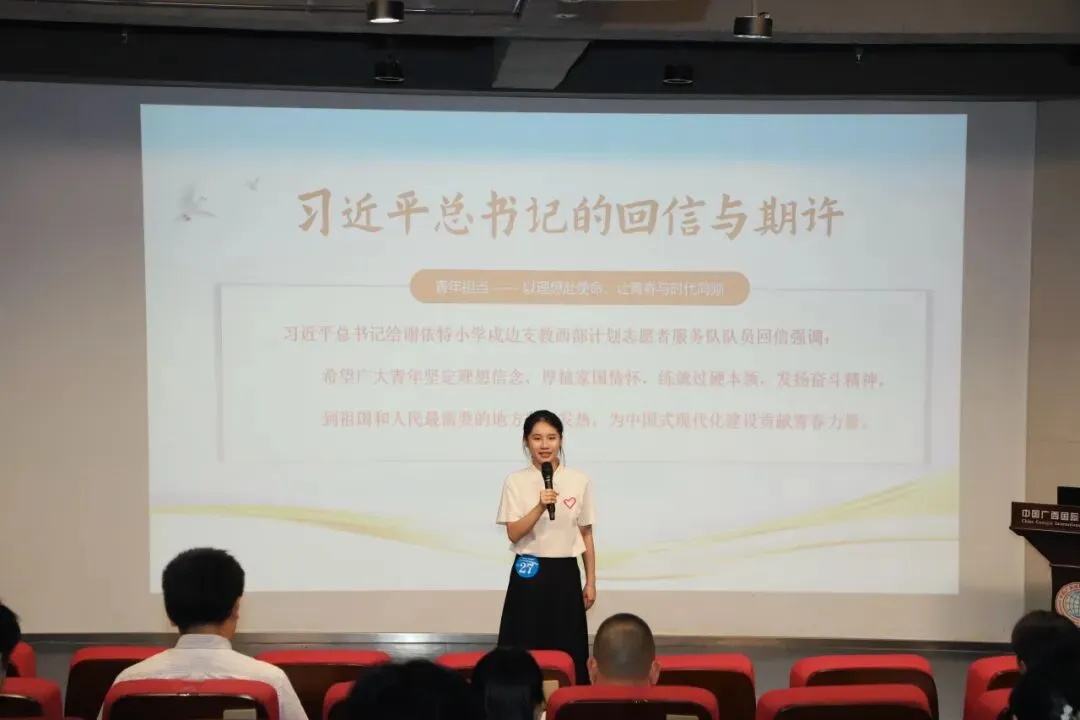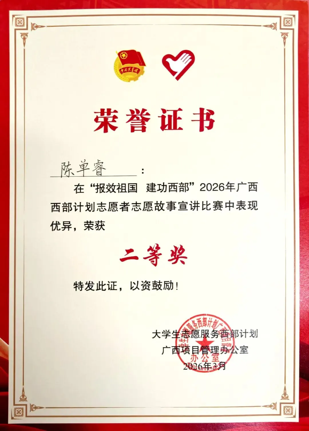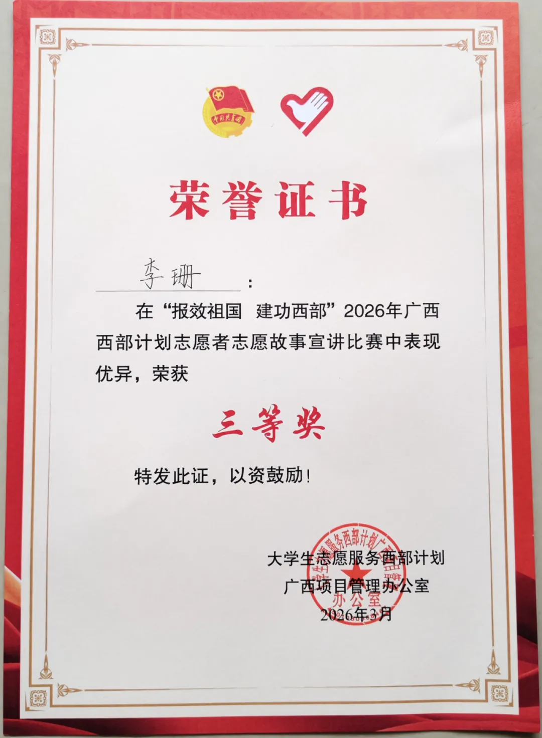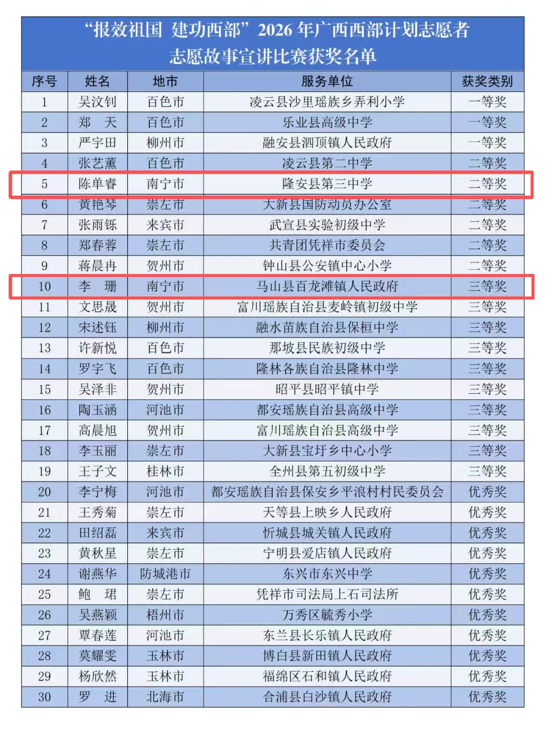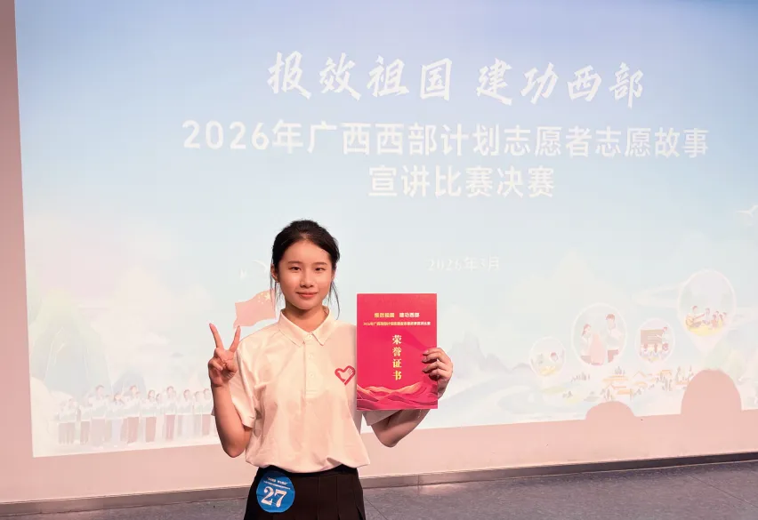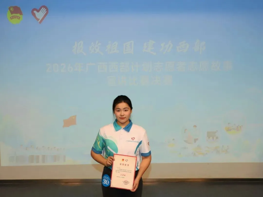近日,“报效祖国 建功西部”2026年广西西部计划志愿者志愿故事宣讲比赛圆满落幕。经过激烈角逐、层层比拼,我市2名西部计划志愿者凭借真情实感的讲述、鲜活生动的基层故事,在全区众多选手中脱颖而出,成功斩获二等奖、三等奖各1名,用青春之声传递志愿力量,展现了首府西部计划志愿者扎根基层、奉献担当的动人风采。