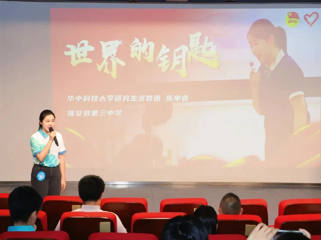 陈单睿,华中科技大学研究生支教团隆安分队队长,2025年8月起服务于隆安县第三中学,任初中数学教师。深耕课堂,她以扎实的专业能力和真诚的关怀深受学生喜爱。走入基层,她带领团队开展了“云山心语”书信交流、“云游华科大”在线研学、“七彩假期”公益课堂等系列活动,服务青少年儿童超1300人次,用千余封信件温暖陪伴244名青少年。“点亮一盏灯,照亮一大片”,她走入隆安三中等多所学校分享经历、讲授团课,用行动讲述志愿故事。从一方讲台到更广阔的天地,陈单睿正以青春热忱为西部的孩子们连接起知识与未来。