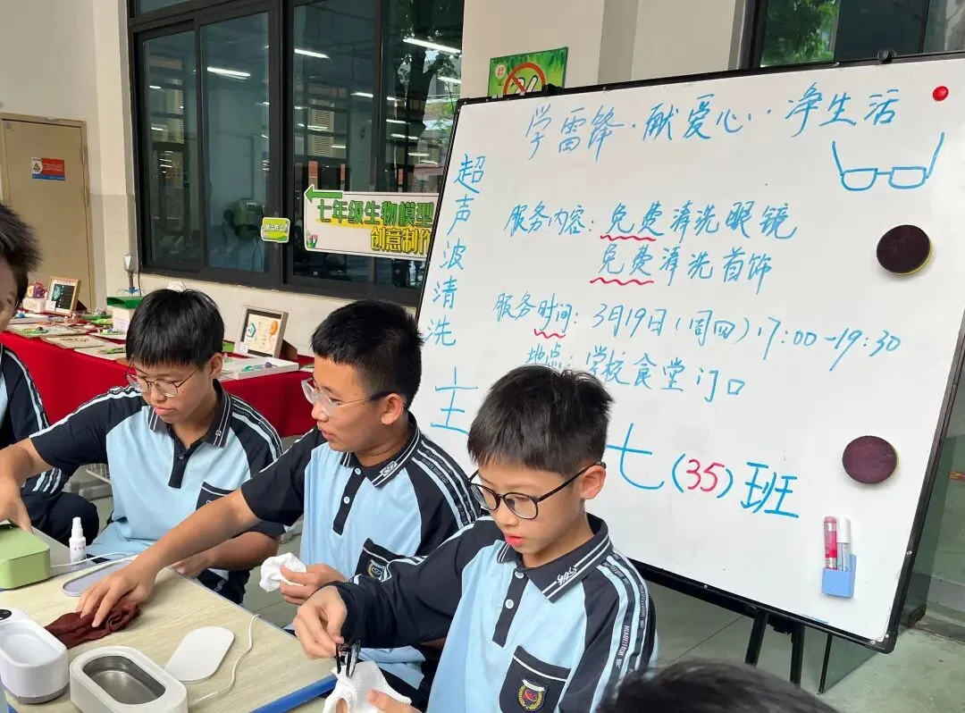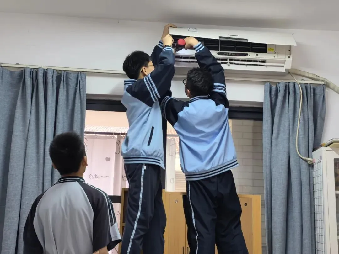 本次活动以服务学校师生为核心,同学们分成多个志愿小组,有序开展便民服务与校园清洁工作。活动中,大家细心为同学和老师们清洗眼镜,让模糊的镜片焕然一新,为大家带来清晰明亮的视觉体验;同时主动协助老师清洗空调、擦拭风扇,认真清理灰尘污垢,不放过任何卫生死角,切实改善了办公与学习环境。