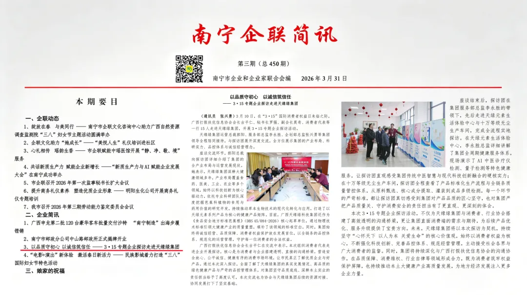 近日,南宁市企业和企业家联合会主办的《南宁企联简讯》2026年第03期(总450期)正式刊发。本期“企业简讯”栏目中,以《以品质守初心 以诚信筑信任——3·15专题企业探访走进天缘绿集团》为题,对广西天缘绿科技集团进行了大篇幅专题报道。作为南宁市企联的重要会员刊物,《南宁企联简讯》长期关注本地优秀企业的发展动态,此次对天缘绿集团的深度报道,充分体现了行业协会及社会各界对集团综合实力、科研品控与诚信经营的高度认可。