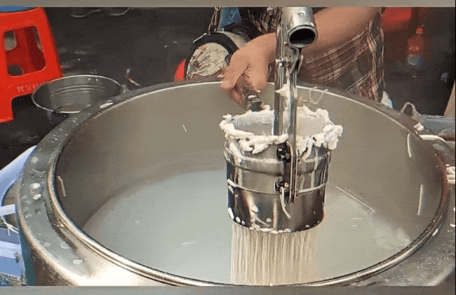 粉团经过压榨成型,现场压榨出的粉条直接落入沸水中煮制,煮至粉条先沉底后浮起,捞起后置于凉水中冷却,最后加入猪肉末、豆腐干、头菜碎经典老三样,倒入高汤即可。