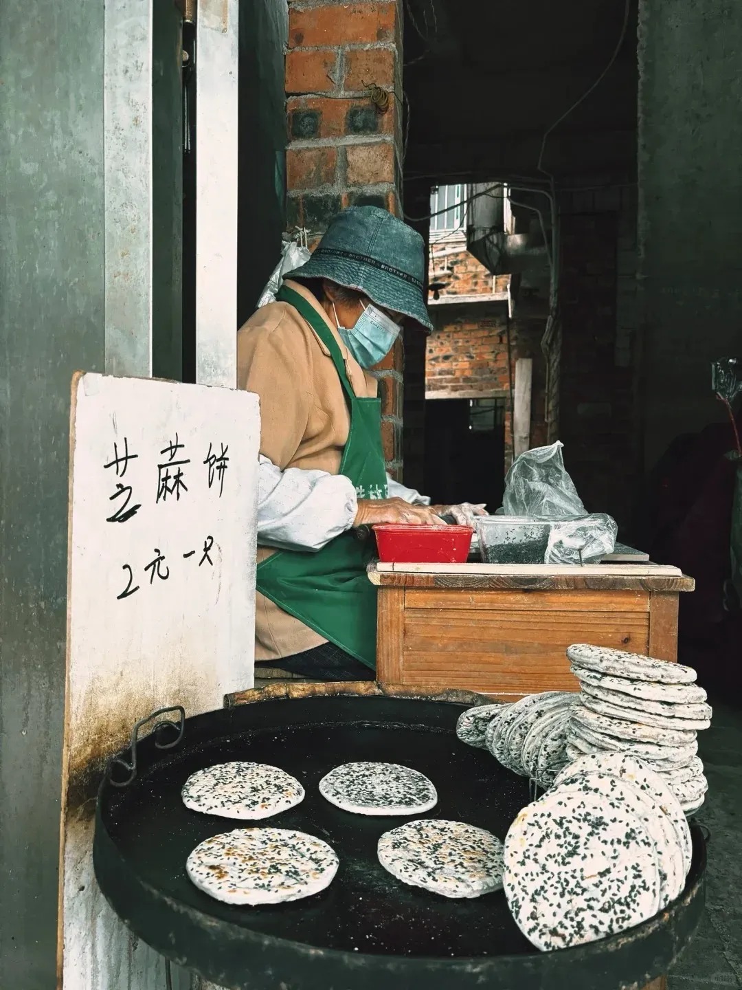 摊位虽小,却不妨碍喷香芝麻饼在锅中的诞生。糯米制作的饼皮撒满了芝麻,常见的内馅有红糖、花生、红薯等。做好的饼放在铁锅上慢慢煎熟,大老远就能闻到饼香。
