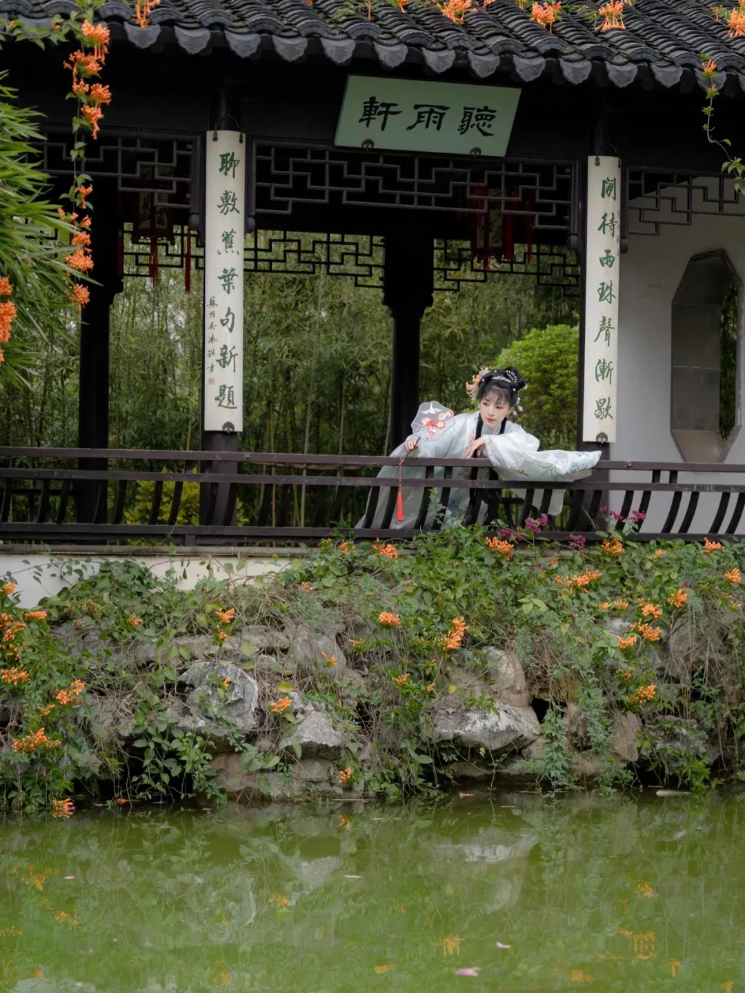 美人衬美景,身着汉服的游客与园内建筑合拍定格的瞬间好似看到了从画中走出的古典美人。
