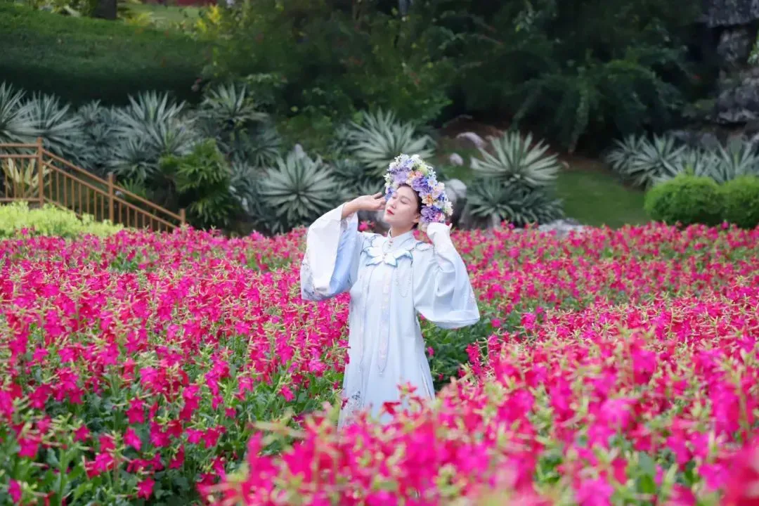 春天,漫步于园博园中绚烂的花海中,加上春风拂面,发丝也被温柔地吹起,此时随手一拍,就可以唯美出片。