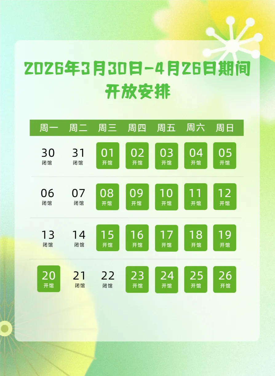 2026年3月30日至4月26日期间,每逢周一、周二正常闭馆维护,4月20日正常开放,4月22日闭馆维护,运营时间为9:30-17:00(16:30停止入馆)。