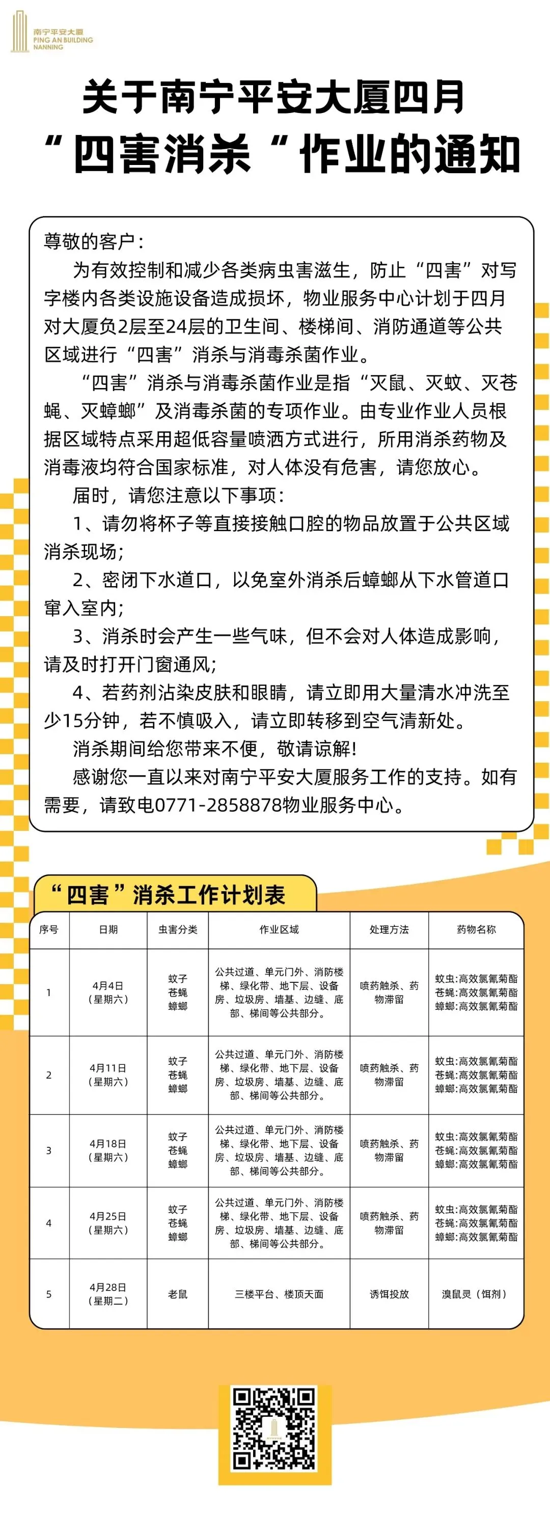 南宁平安大厦 | 四月“四害消杀”作业的通知