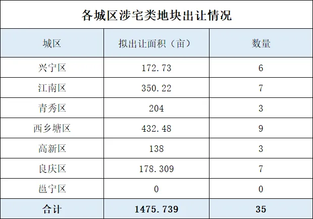 青秀区:拟出让15宗地,共约808亩。涉宅类204亩、商服53.38亩。
