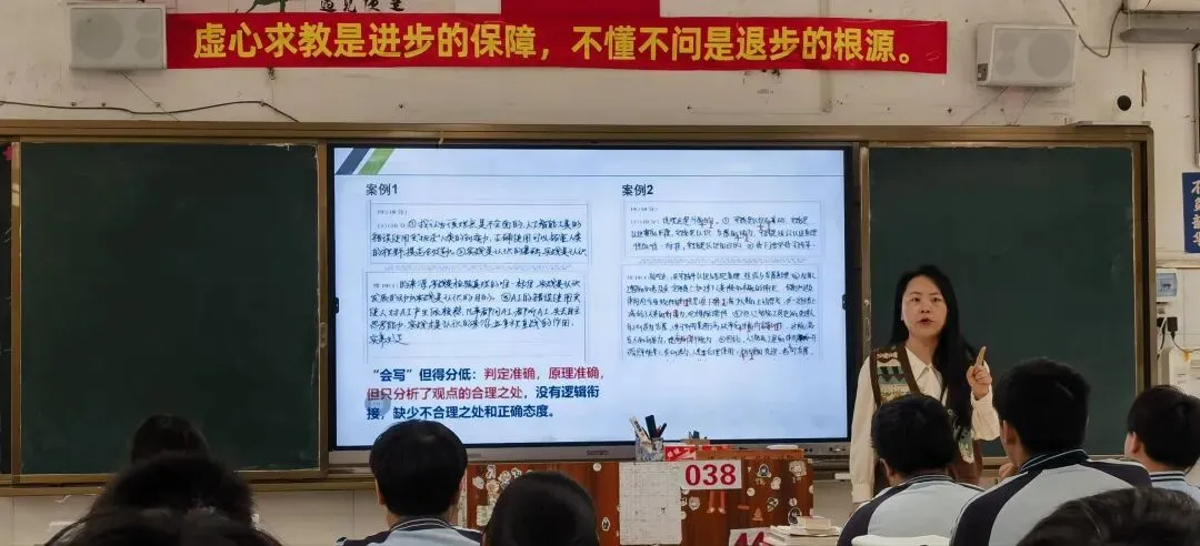 李晓云老师以《哲学主观题:从“会写”到“写对”的思维进阶之路》为题,紧扣本次二模答题实况,直击学生原理记忆不牢、审题定位不准、材料结合不紧、逻辑表达不清等共性失分问题,通过低分卷与高分卷直观对比,清晰点明答题误区与得分关键。
