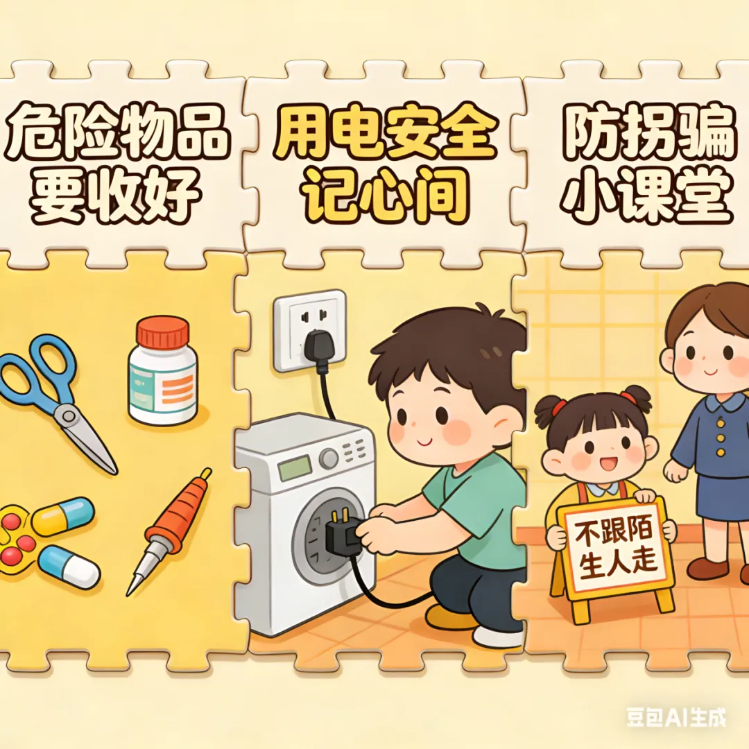 2.危险物品管理:将药品、刀具、打火机、热水壶、尖锐物品等放置在幼儿接触不到的地方,避免误食、划伤、烫伤等意外。