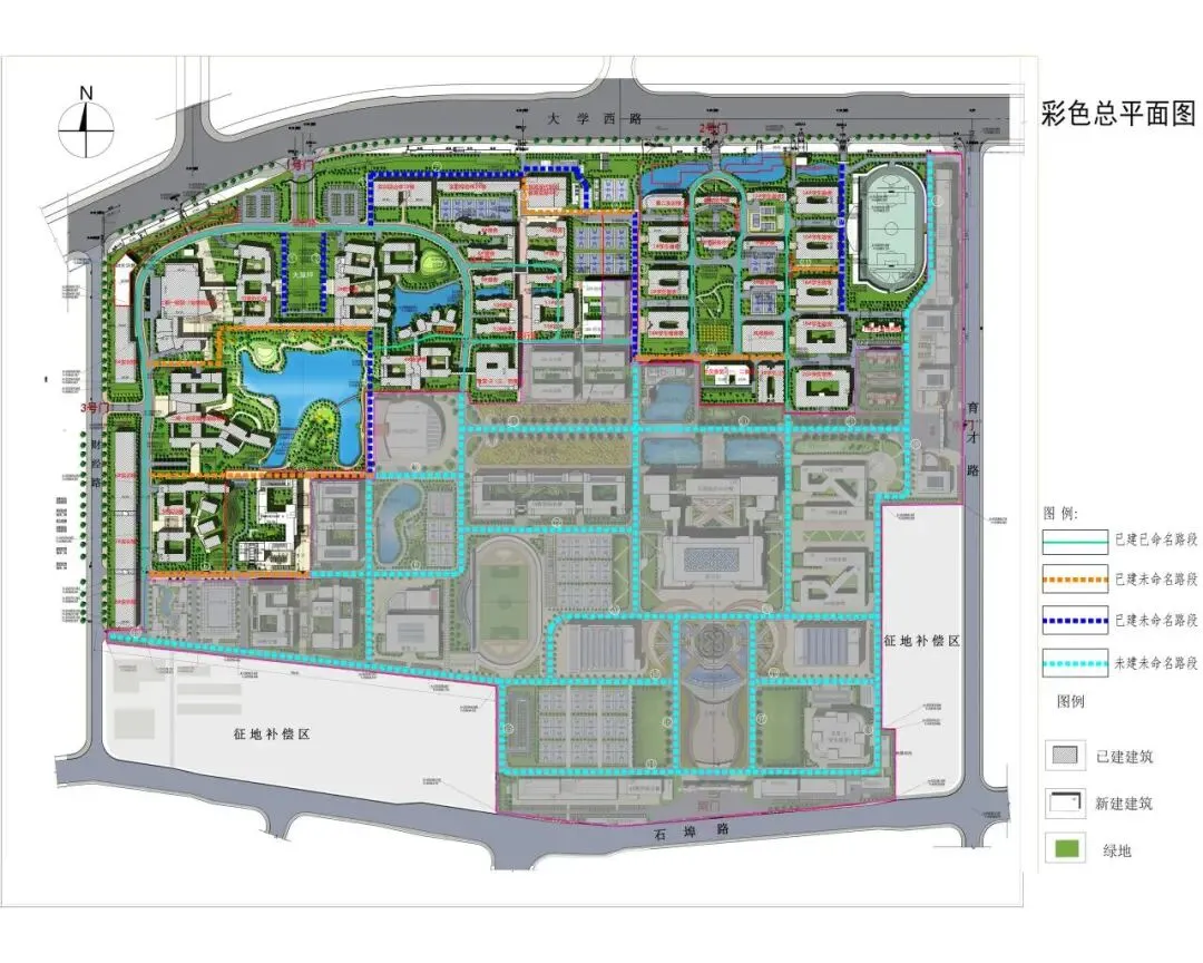 3. 整体统一:校内主次干道名称需风格协调,避免杂乱无序,同时与外围市政道路(大学西路、石埠路等)形成有序衔接,彰显校园整体风貌。