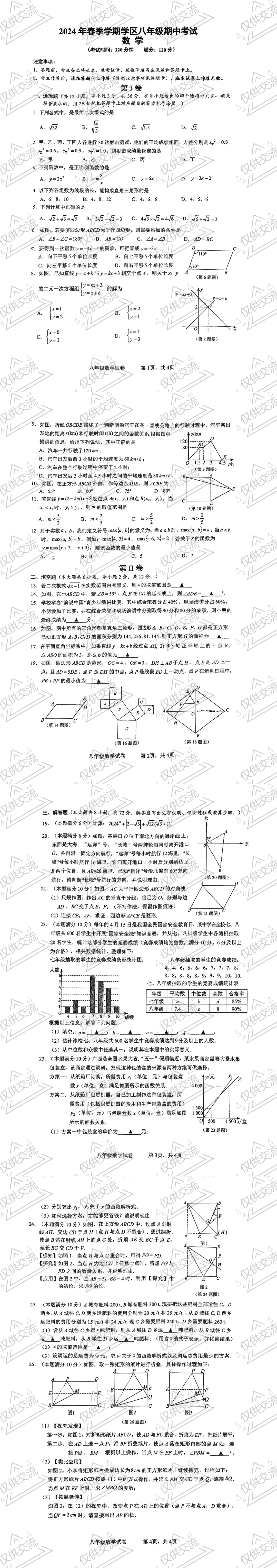 >南宁各县区八年级数学下学期月考期中期末试题及答案