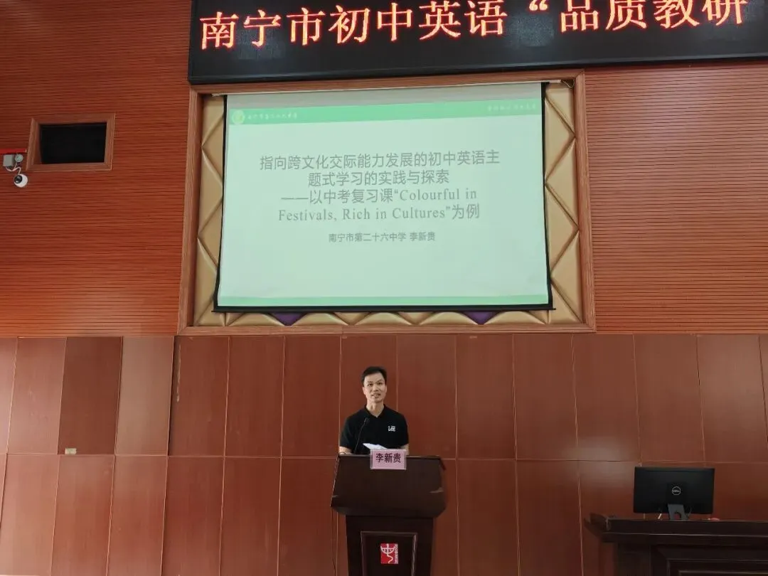 吕海华老师和学生们进行课例展示 随后,南宁市第二十六中学李新贵老师作《指向跨文化交际能力发展的初中英语主题式学习的实践与探索》专题讲座。他结合中考真题与课堂实例,深入阐释主题式学习的设计思路与实施路径,分享“以读促说、以说促写”的教学路径,帮助教师明晰如何在日常教学中自然融入文化元素,为跨文化教学提供实操策略。 李新贵老师做专题讲座 徐新强老师做专题讲座