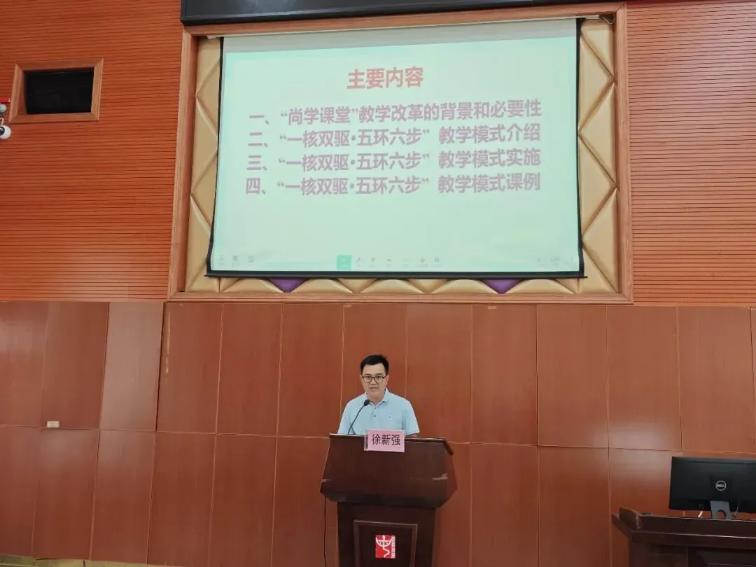 南宁市第四中学徐新强老师作《“一核双驱·五环六步”尚学课堂教学模式构建与实施》专题讲座。他结合学校课堂教学改革实例,深入阐释了“一核双驱·五环六步”尚学课堂教学模式,即围绕“学生核心素养培育”这一核心,通过“目标任务驱动”和“数据智能驱动”两个抓手,应用“PDCAF”闭环教学理念构建五大教学环节和六大学习步骤,清晰的结构框架和实施路径提供了可借鉴的实践范本。