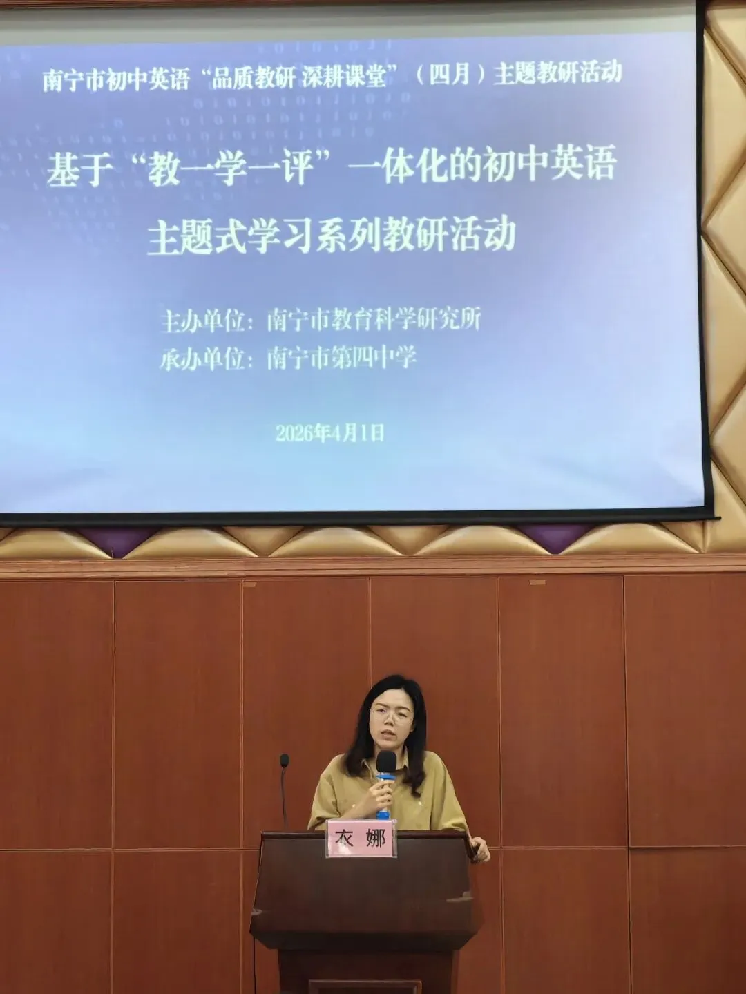 四月芳菲,教研正浓。为探索主题式学习在初中英语复习课中的有效落地,发展学生核心素养,2026年4月1日,南宁市初中英语学科“教—学—评”一体化主题式学习系列教研活动在南宁市第四中学民主校区圆满举办。本次活动涵盖课例展示、专题讲座、专家点评等环节,聚焦中外文化融合与中考备考新路径,全市各县区初中英语教研员、市级学科兼职教研员、中心组成员及各校教师代表齐聚现场,共研共进。