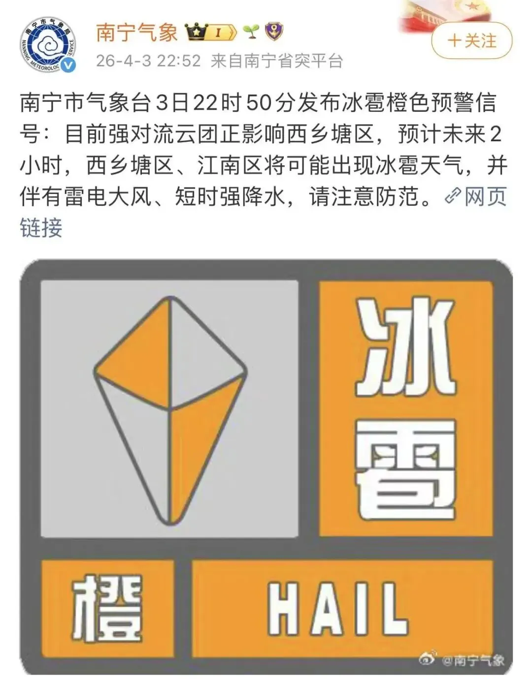 4月3日22时50分,南宁市气象台发布冰雹橙色预警信号:目前强对流云团正影响西乡塘区,预计未来2小时,西乡塘区、江南区将可能出现冰雹天气,并伴有雷电大风、短时强降水,请注意防范。