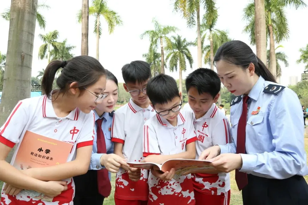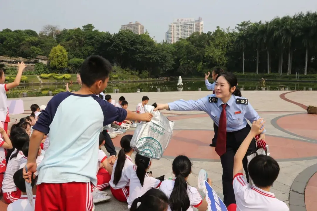 第35个全国税收宣传月期间,国家税务总局南宁市西乡塘区税务局税务人员与南宁市月湾路小学的学生们来到南湖公园,开展“税月童行 民族花开”青少年税收普法活动。(彭寰 摄)
