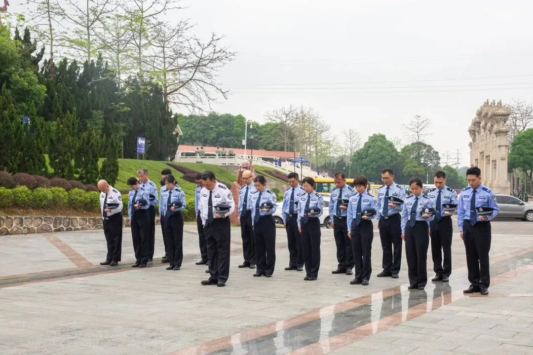 在公安英烈纪念碑前,全体人员神情肃穆,向公安英烈脱帽默哀,表达对公安英烈的深切缅怀和崇高敬意。