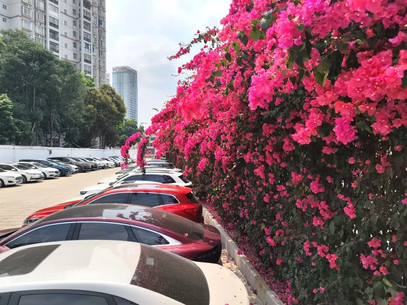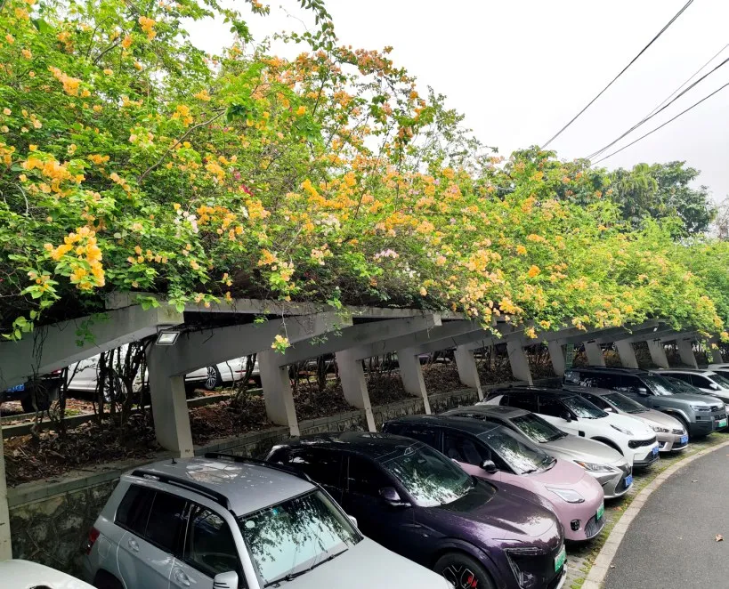 青秀山北门附近的多处停车场,三角梅肆意蔓延,或垂落于围栏,或攀附于廊架,汇成绚烂花瀑,让原本单调的停车区域化作春日秘境。联勤保障部队第九二三医院停车场内,亦是花意盎然,三角梅开得热烈奔放,红得浓烈、粉得娇艳,与往来身影相映成趣,为忙碌的日常添了几分诗意与欢喜。联勤保障部队第九二三医院停车场内的一片花墙。